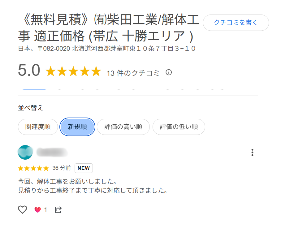 こちらは Google口コミ になります。
