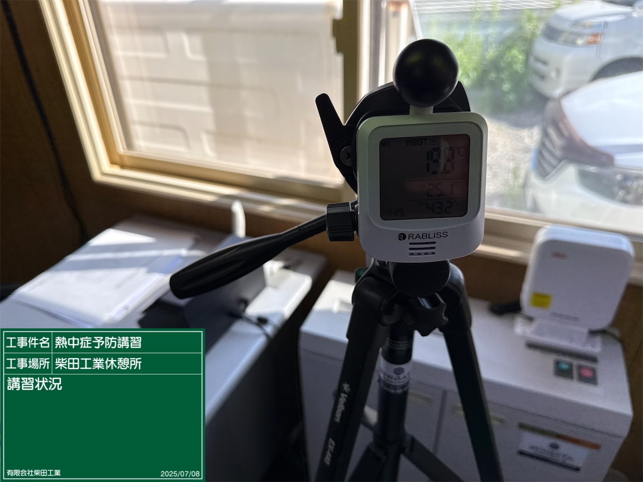 このように、気温・湿度・輻射熱を総合的に把握できる「黒球式WBGT計」を導入しており、リアルタイムで現場の危険度を数値で確認できます。