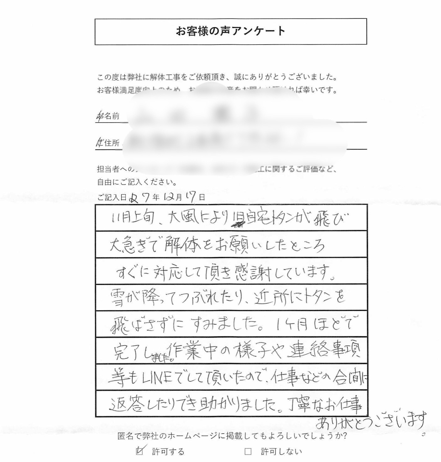 【お客様の声】突風による屋根被害にも迅速対応。ご近所配慮と丁寧な連絡で安心の解体工事